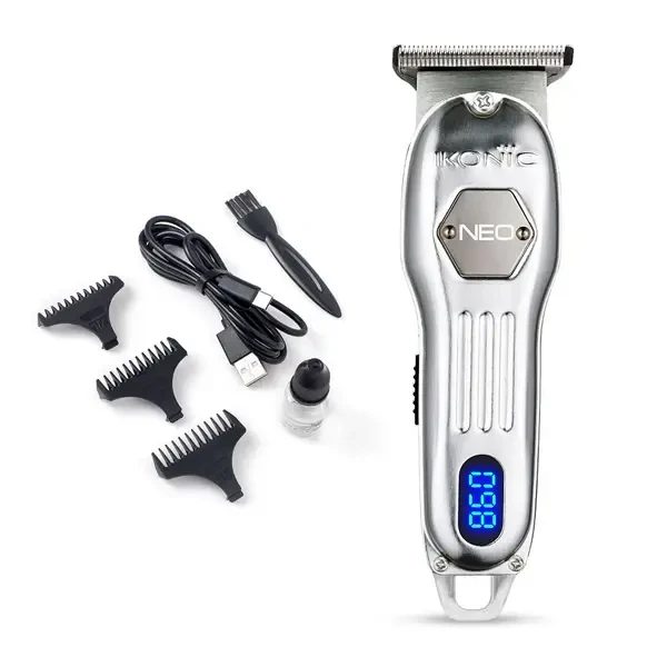 The IKONIC NEO Trimmer offers professional grooming with cordless flexibility and a powerful rechargeable DC motor. Featuring an LED display, low-noise design, and interchangeable colour cases, it includes precision guides for 0.5mm, 1mm, and 1.5mm. Achieve versatile, detailed trimming for stubble, short beard, and light trim effortlessly.